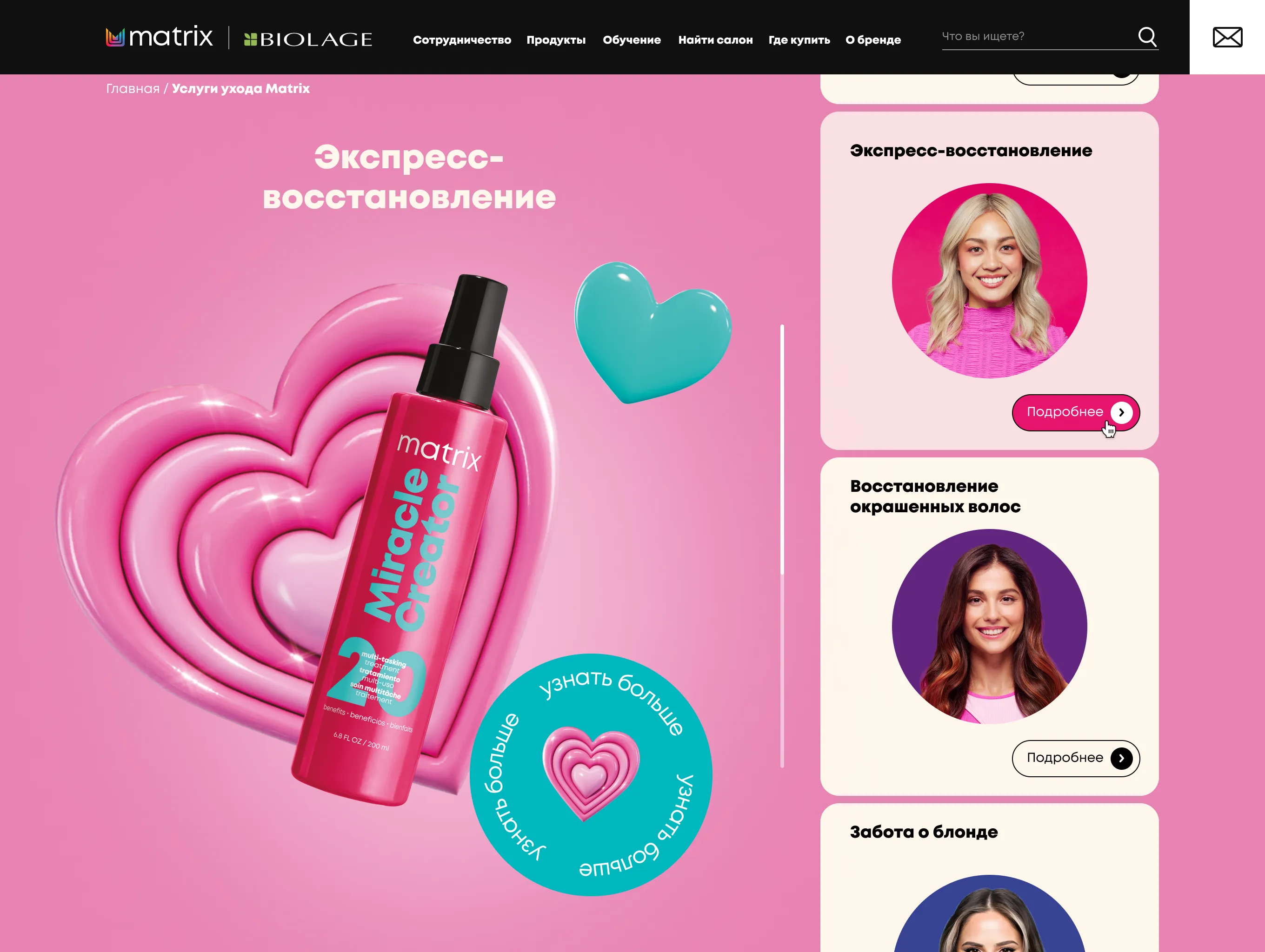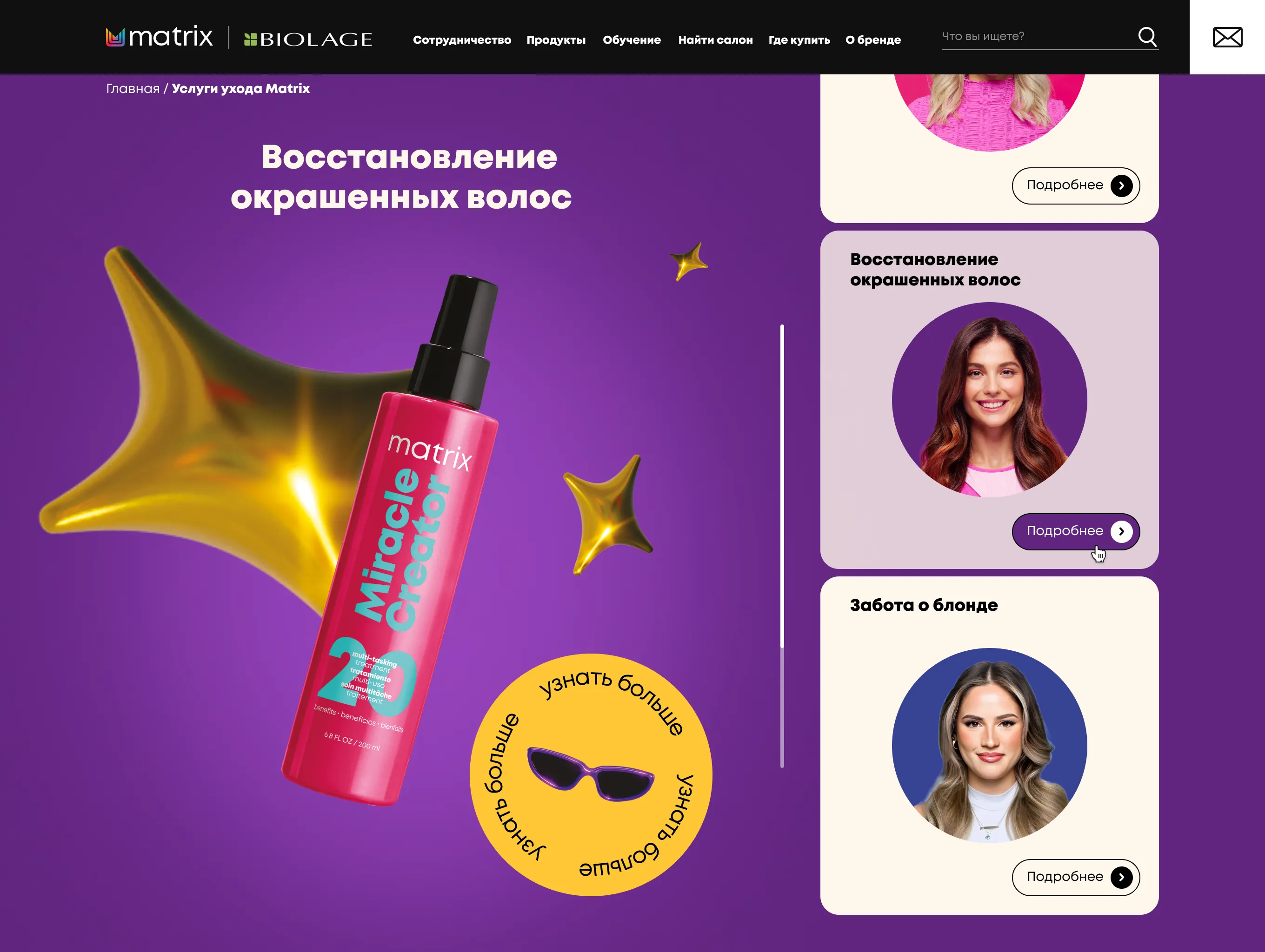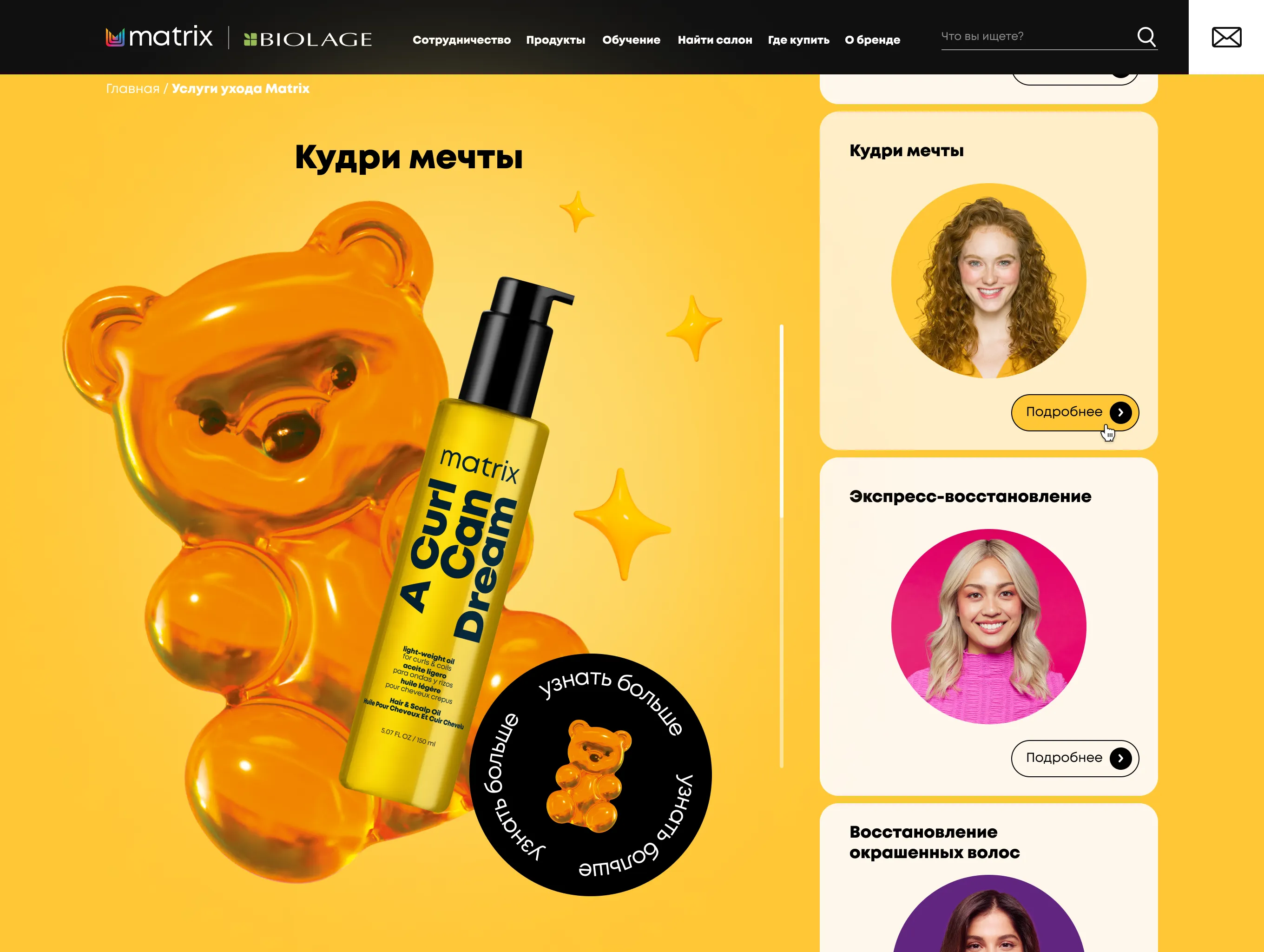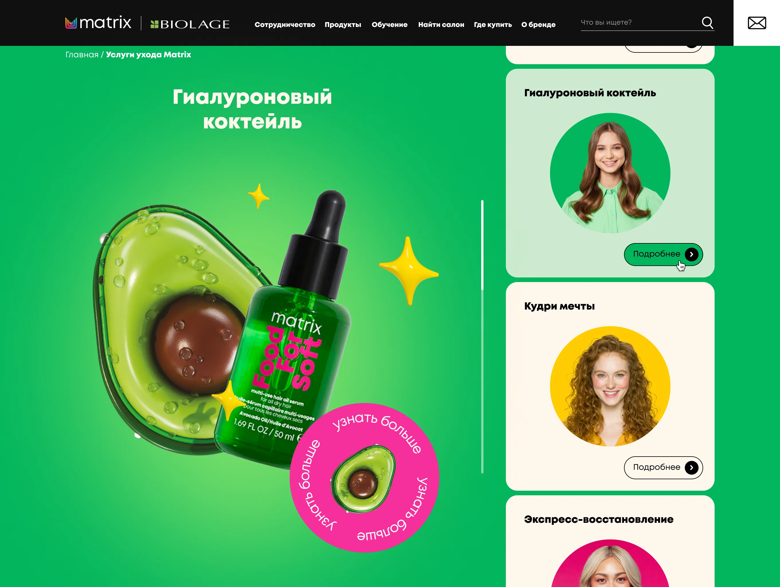 Mygento предстояло разработать промо-сайт, который объединял бы информацию о широком спектре профессиональных услуг Matrix, группируя их по категориям, связанным с различными типами волос и задачами ухода.