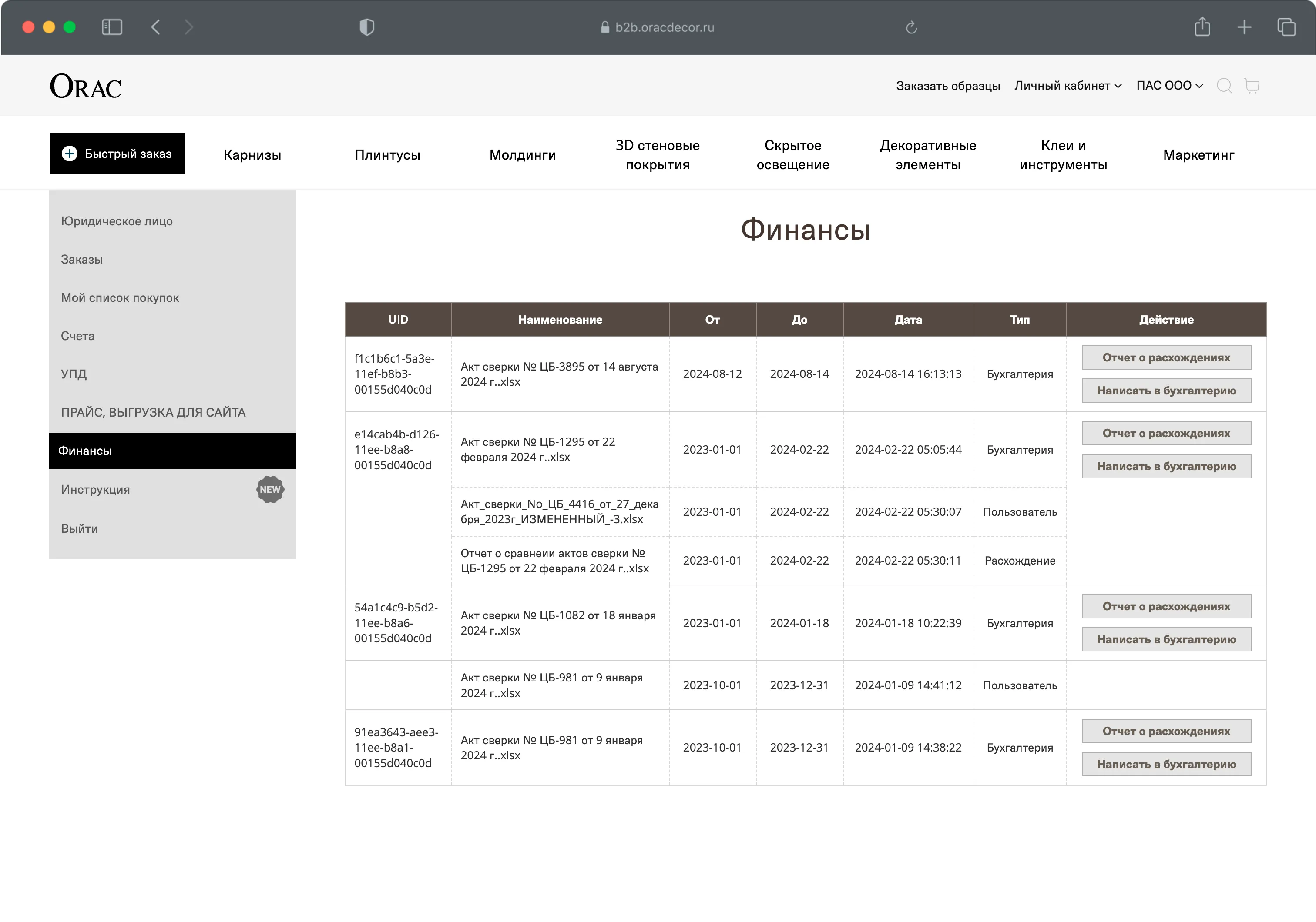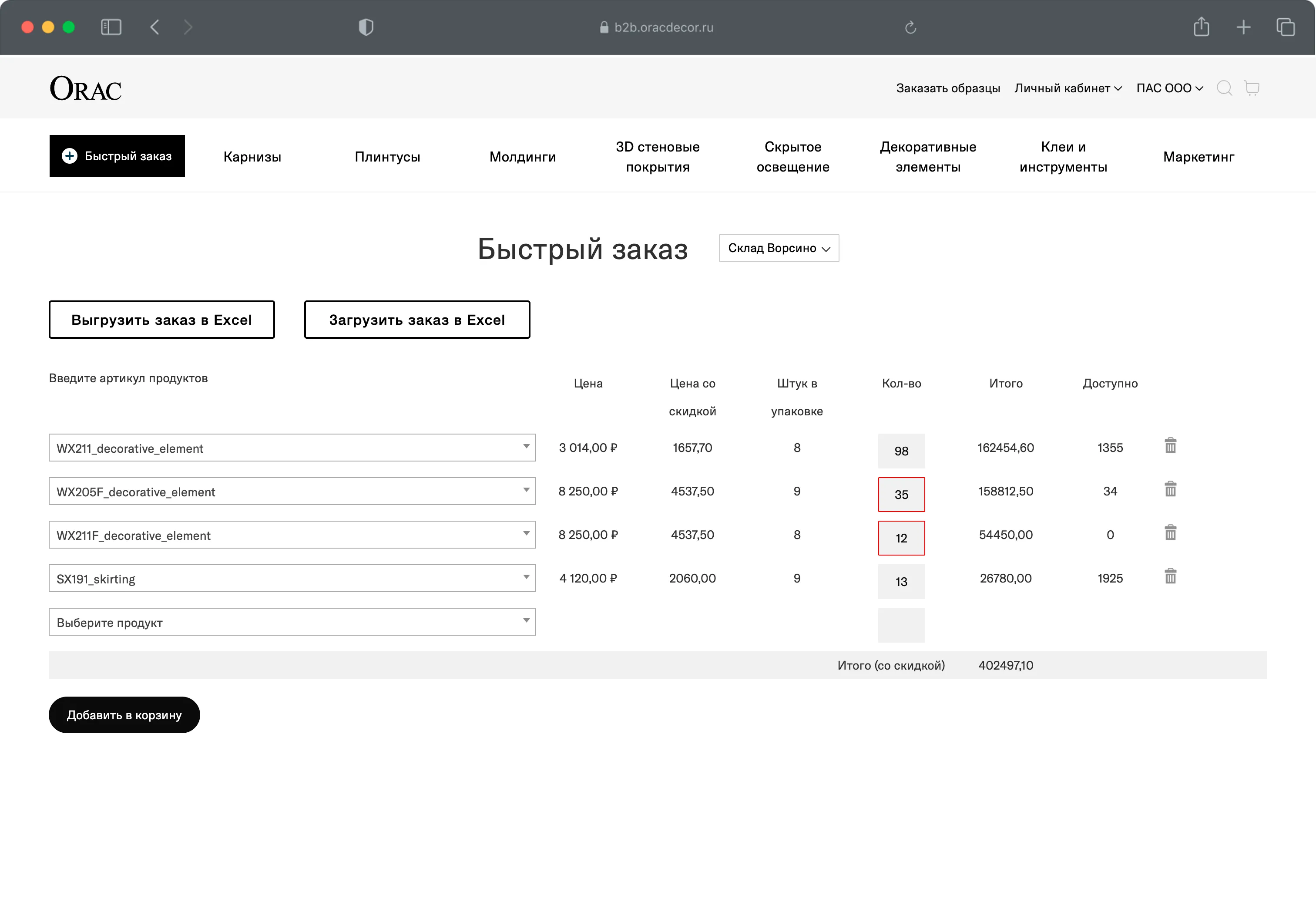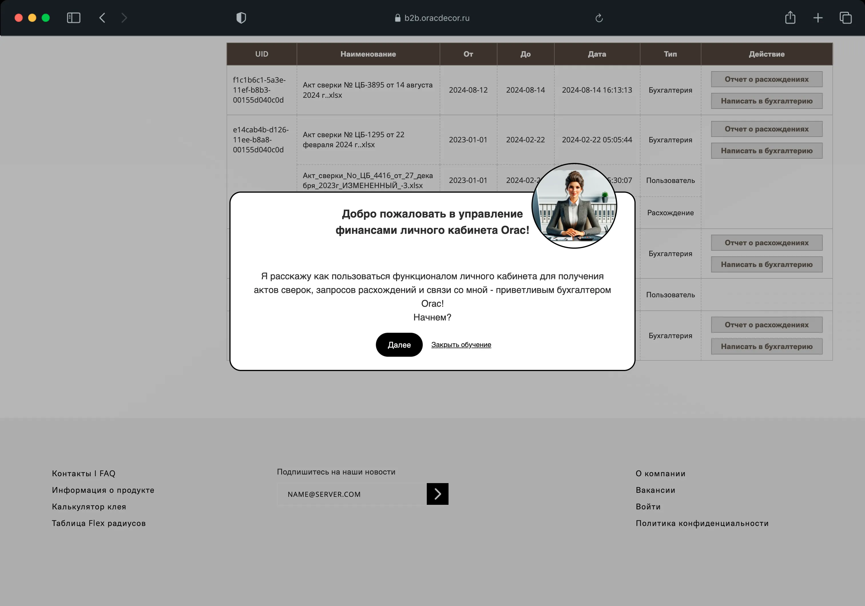 Задача: оцифровать процесс B2B-сделок, минимизировать зависимость процесса от человеческого фактора, повысить прозрачность и эффективность бизнеса: интегрировать дилеров и дистрибьюторов в единую систему логистики и продаж ORAC, обеспечить конечных участников B2B продаж — B2C компаниям возможность самостоятельного оформления и отправки заказов дилерам и/или дистрибьюторам, предоставить возможность заказа любых наименований и в любом количестве.