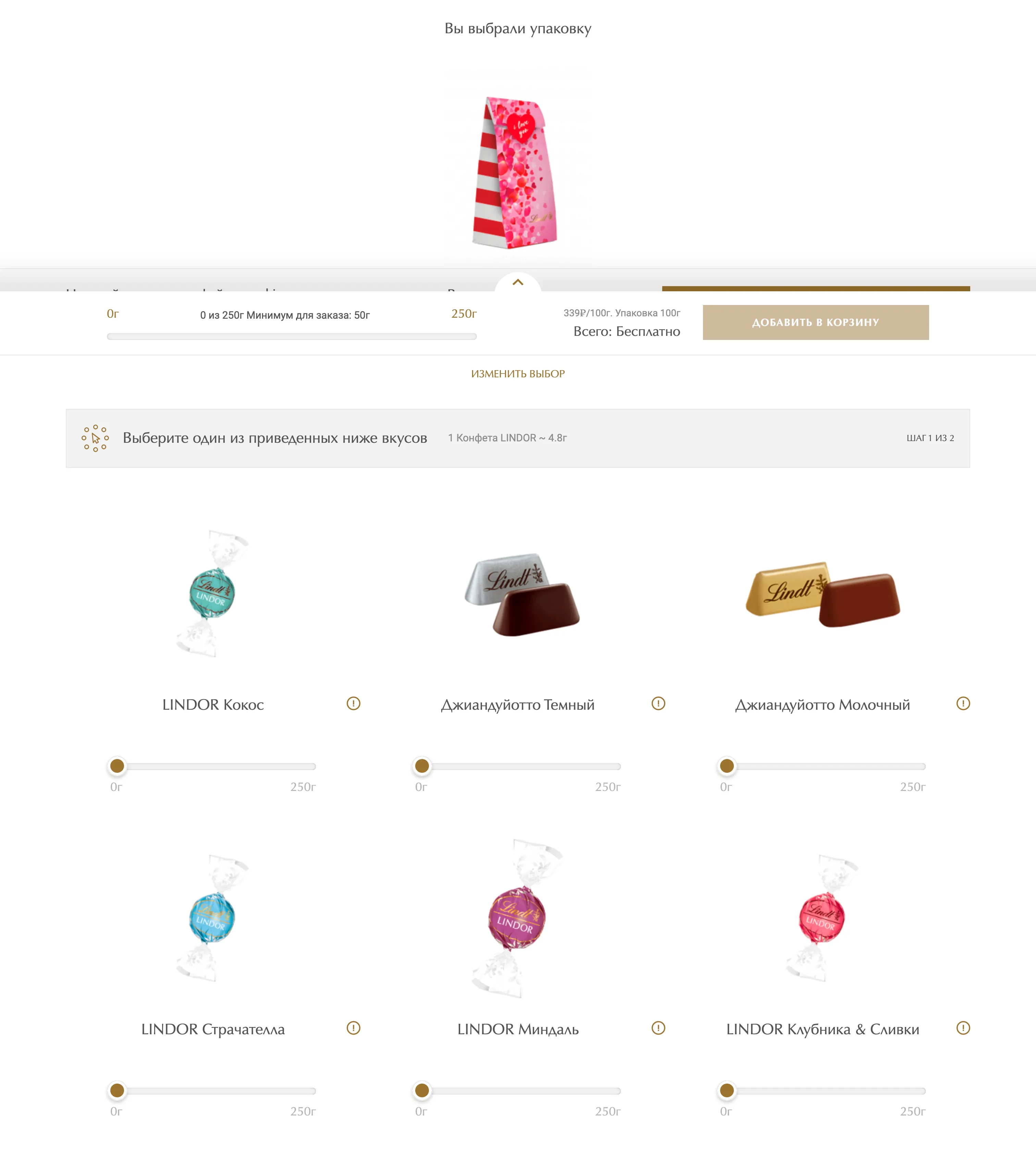 Команде Mygento предстояло разработать промо-сайт с функционалом pick-n-mix, который позволял бы покупателям собирать подарочную коробку с конфетами Lindor разных вкусов и добавлять индивидуальные пожелания.
