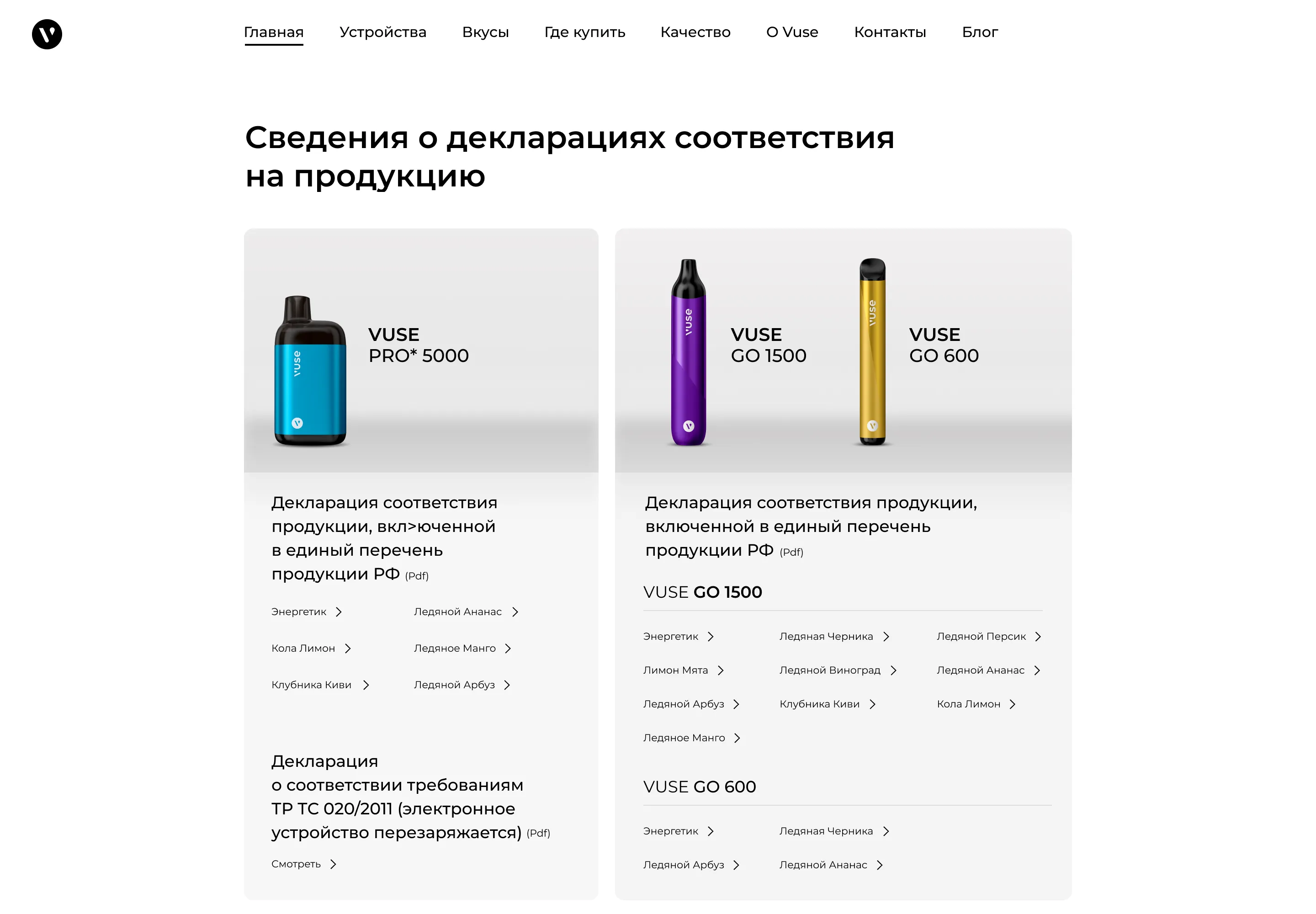 Создан удобный каталог, в котором пользователи могут легко фильтровать устройства и жидкости по типу, вкусу, интенсивности и другим характеристикам.