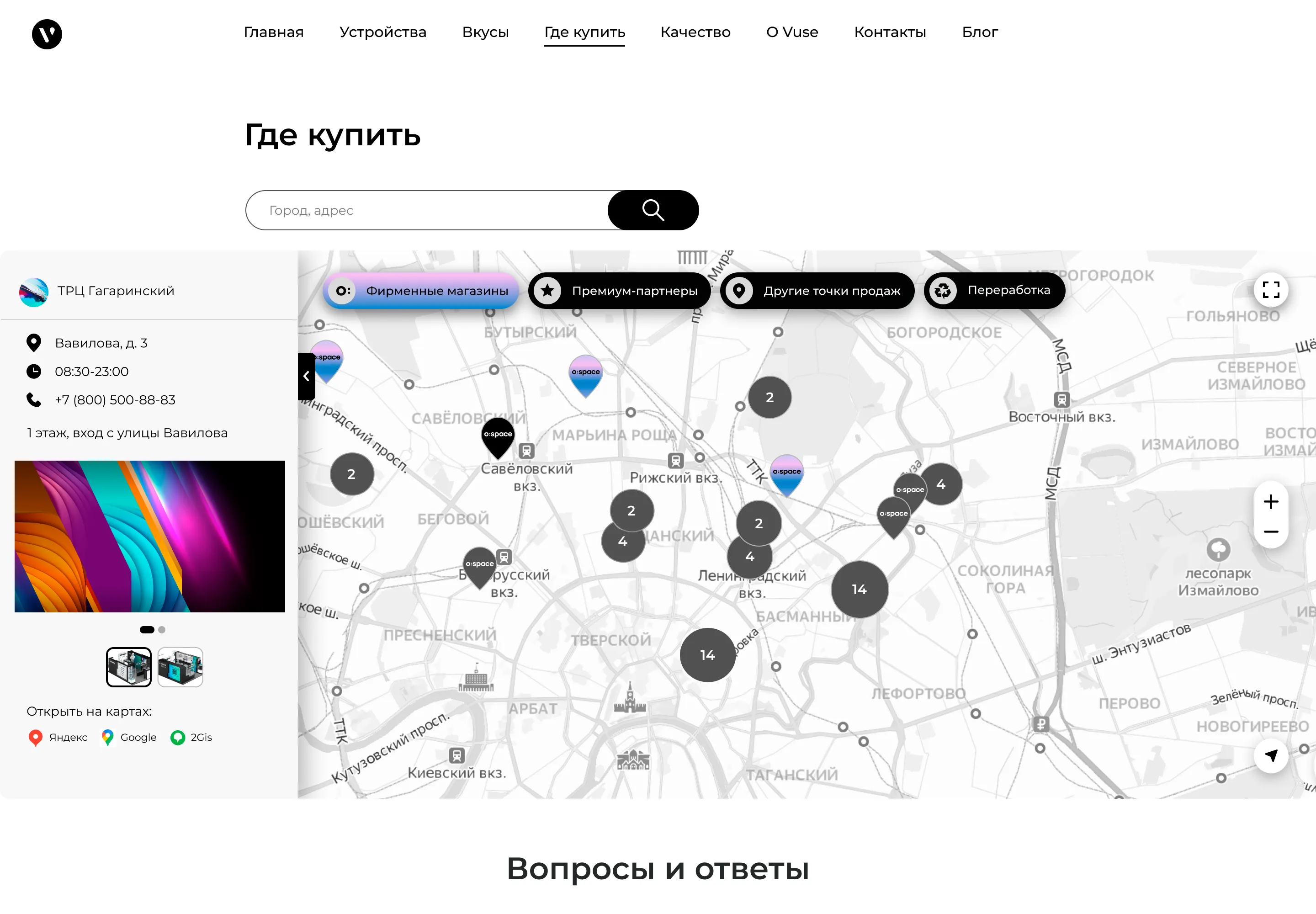 Реализована кнопка “Где купить”, которая перенаправляет на карту магазинов с продукцией.