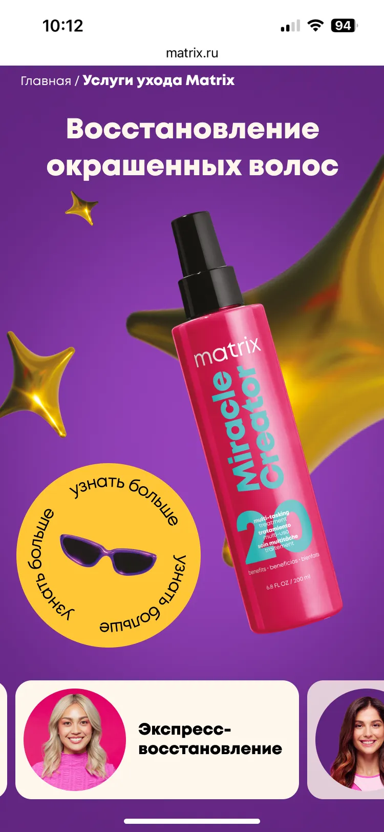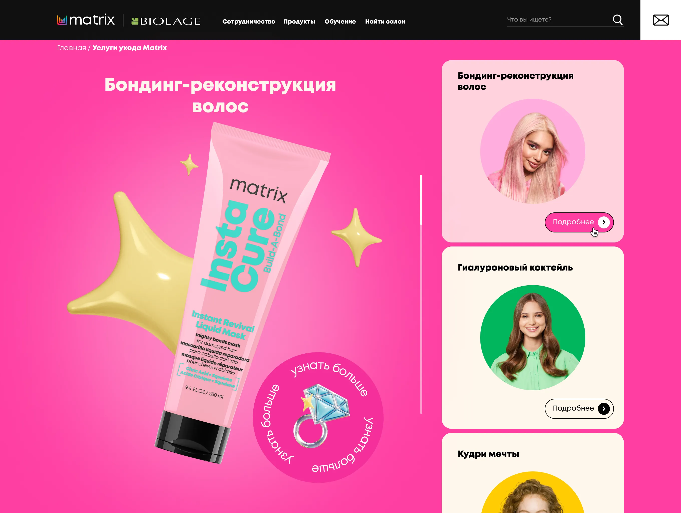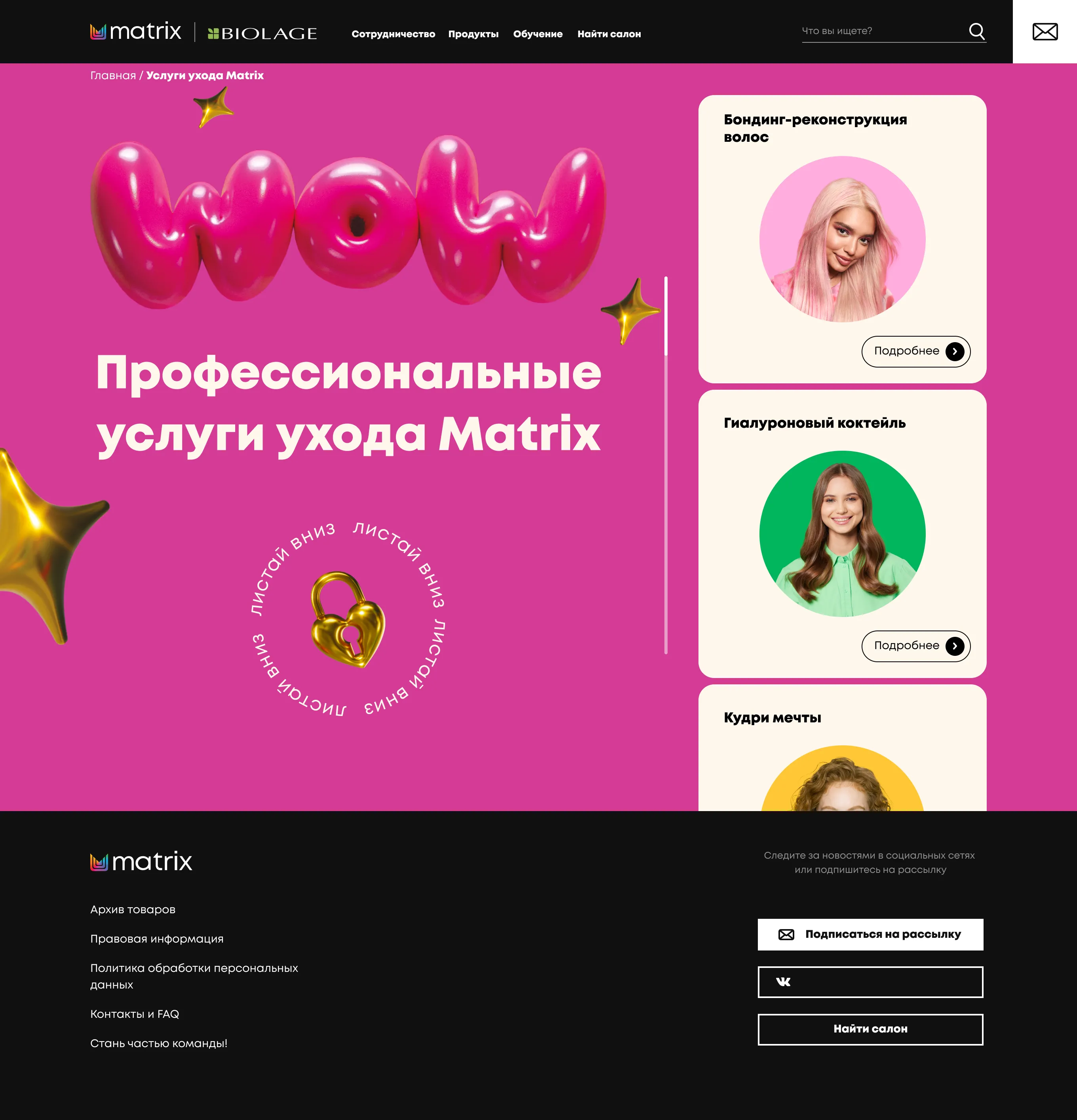 Mygento предстояло разработать промо-сайт, который объединял бы информацию о широком спектре профессиональных услуг Matrix, группируя их по категориям, связанным с различными типами волос и задачами ухода.