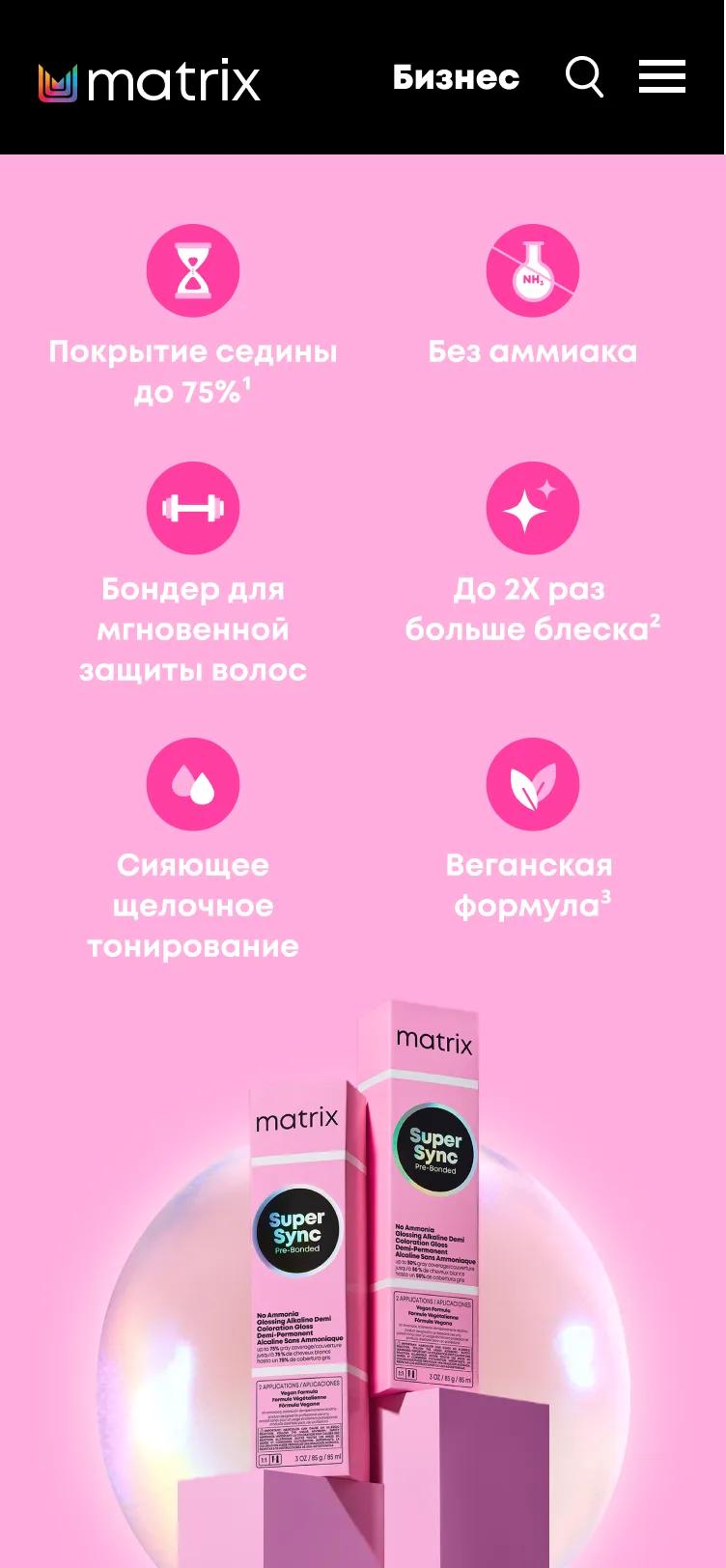 Основные преимущества Super Sync: акцентировали внимание на его стойкости, мягкости воздействия и способности создавать насыщенный блеск при покрытии до 75% седины.